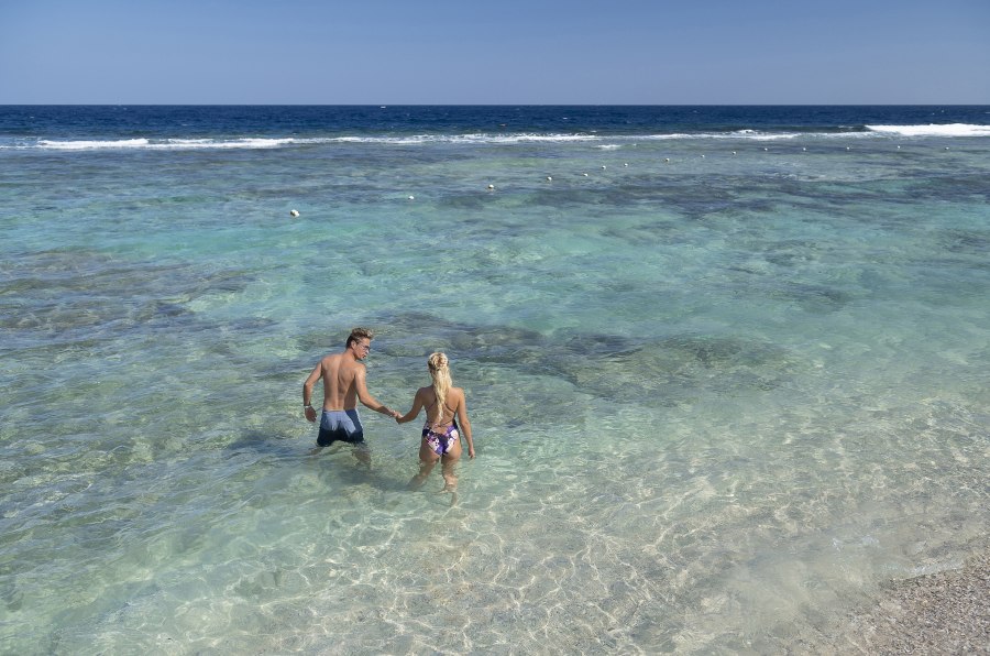 Direttamente sul mare, gode di una bella spiaggia di sabbia lunga 750 m con breve pontile in legno (50 m) che facilita l'accesso al di là del reef. E’ attrezzata con lettini e ombrelloni a disposizione degli ospiti.