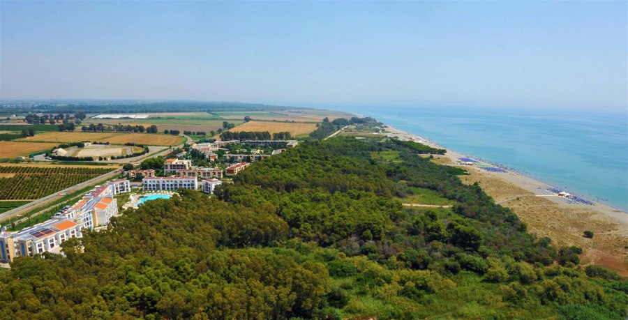 Il villaggio turistico, con accesso diretto al mare, è immerso completamente nel verde in un paesaggio dominato da dune ricoperte dalla macchia mediterranea in prossimità dell’arenile. È composto da un corpo centrale adibito a hotel e da unità a schiera destinate ai residence ed è dotato di un moderno sistema di building automation. Grazie alla vicinanza al mare e ai servizi offerti, è un’ottima scelta per le famiglie con bambini. Dista circa 150 km dagli aeroporti di Brindisi e Bari.