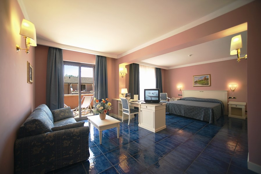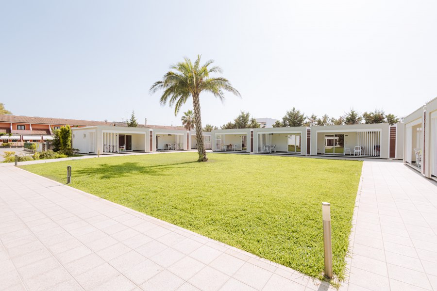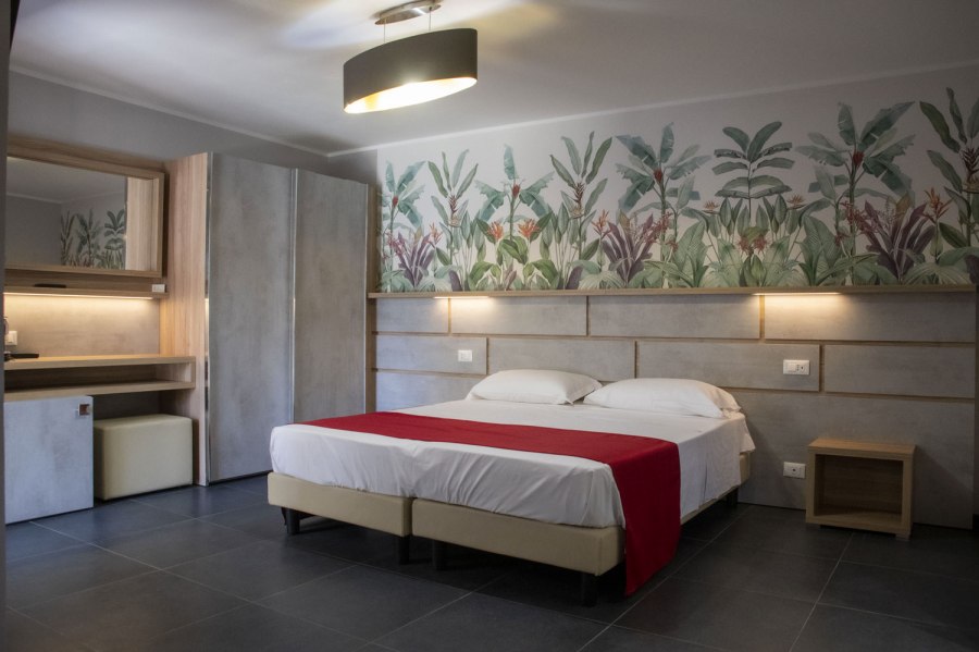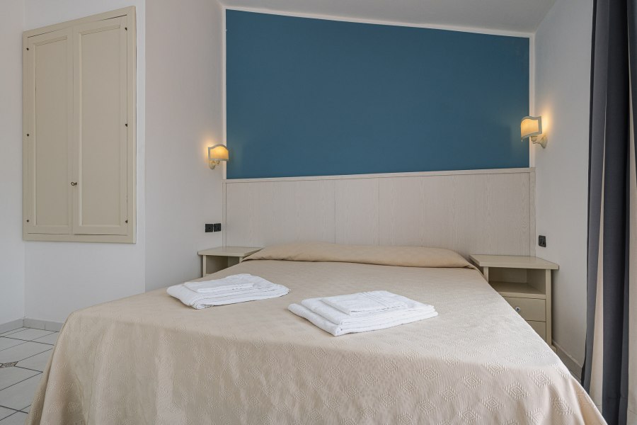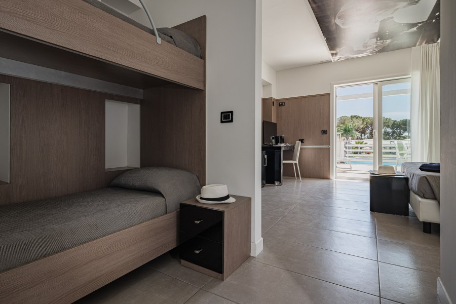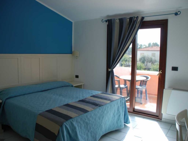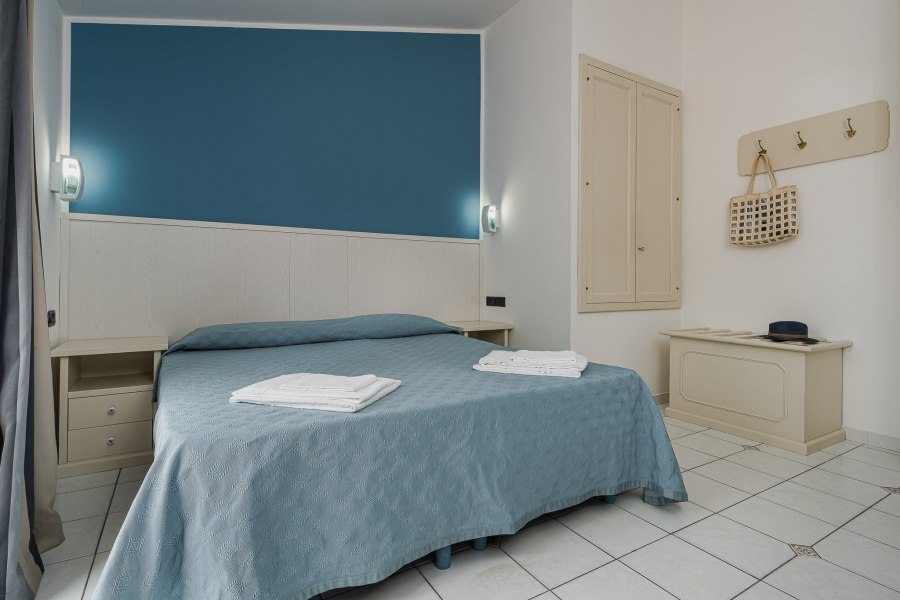 90 camere tutte dotate di balcone o terrazza, TV, servizi con vasca o doccia e asciugacapelli, aria condizionata e minifrigo o frigo. Si suddividono in: Classic, fino a 4 posti letto, arredate in stile classico e ubicate in un edificio a schiera nel corpo centrale. Possono essere a piano terra, composte da letto matrimoniale e divano letto alla francese, o al primo piano composte da letto matrimoniale e letto aggiunto; Junior Suite, fino a 6 posti letto, ubicate nel corpo centrale e più ampie rispetto alle Classic, dispongono di due letti matrimoniali e un divano letto alla francese. Su richiesta disponibilità di camere junior suite per persone con disabilità; Family Room, fino a 7 posti letto, situate in un edificio a schiera, prospiciente a quello che ospita le camere Classic. Sono costituite da appartamenti con angolo cottura convertiti in formula hotel, disposti su 2 piani collegati da scala interna. Si suddividono in Bilocali (fino a 5 posti letto), composti da ingresso soggiorno con 2 posti letto, doppi servizi, di cui uno solo completo con doccia, piano superiore con camera matrimoniale; Trilocali, fino a 7 posti letto, composti come i Bilocali, ma con due camere da letto al piano superiore, doppi servizi con due docce (piano terra e primo piano); Hollywood, fino a 4 posti letto, camere ispirate alle celebrità del cinema internazionale, arredate in stile moderno e ubicate nelle vicinanze della piscina. Dispongono di veranda attrezzata e angolo cottura esterno a scomparsa, letto matrimoniale e divano letto alla francese se a piano terra, con terrazzo attrezzato, letto matrimoniale e letto a castello nell'ingresso se al primo piano. Dispongono di TV e servizi con doccia; Suite Hollywood, fino a 5 posti letto, al primo piano composta da due ambienti con letto matrimoniale, 2 letti singoli e letto singolo in alcova e ampio terrazzo, al piano terra composta da ambienti separati e patio esterno; Garden, fino a 4 posti letto, camere di recente realizzazione in bioedilizia, tutte al piano terra con veranda attrezzata, camera con letto matrimoniale e poltrona letto o divano letto alla francese.