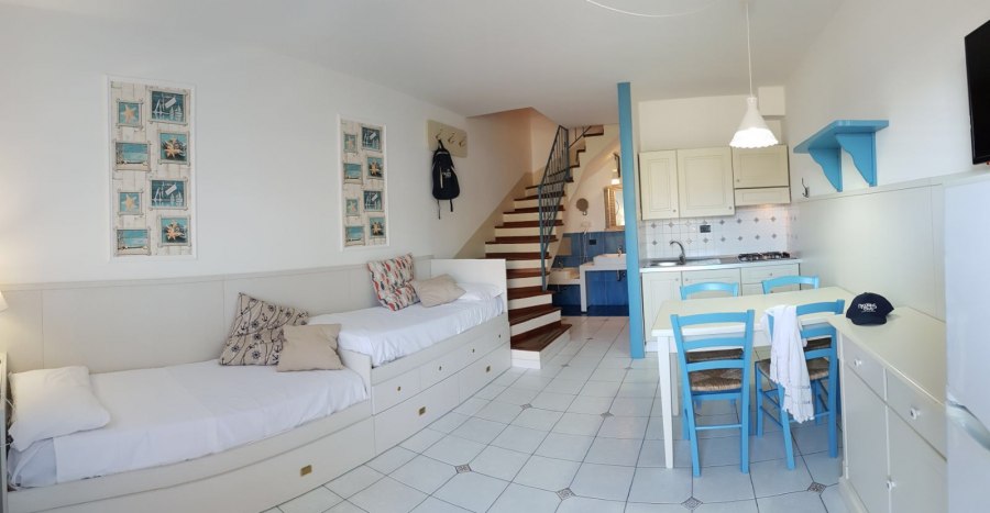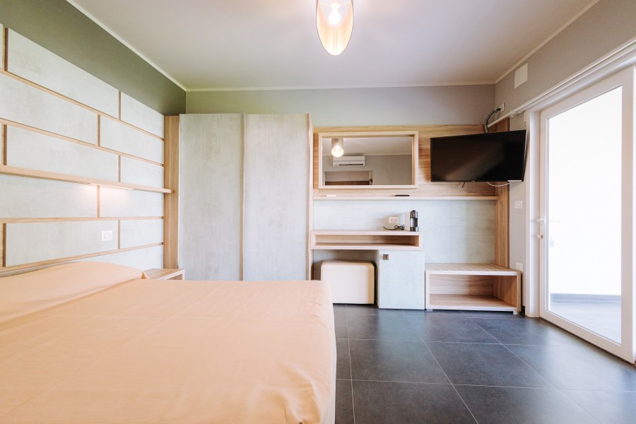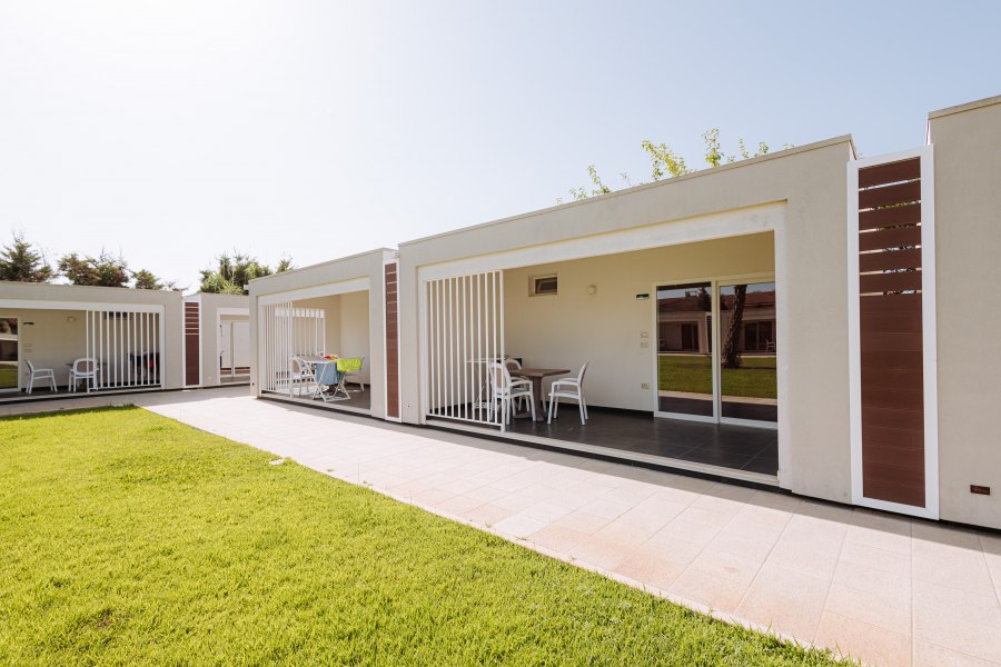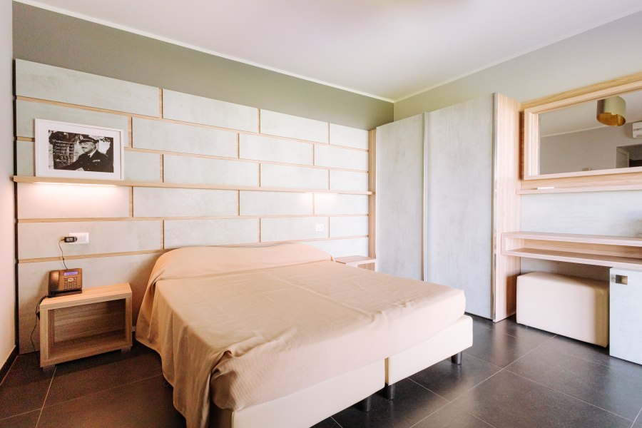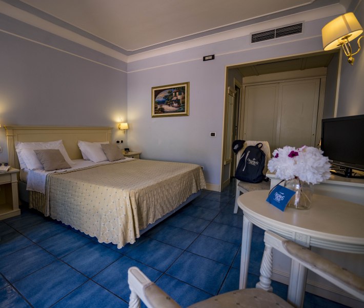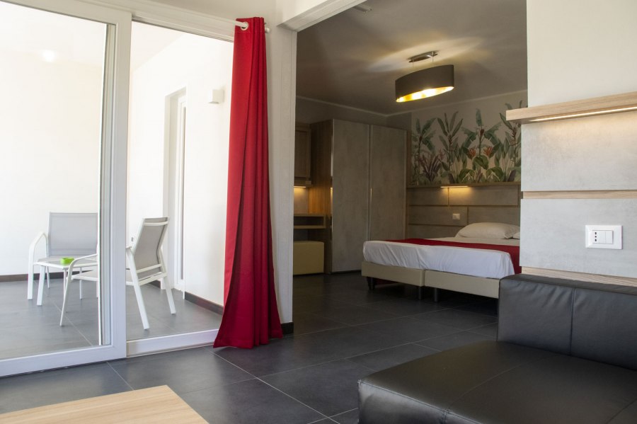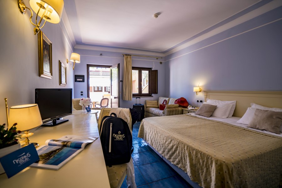 90 camere tutte dotate di balcone o terrazza, TV, servizi con vasca o doccia e asciugacapelli, aria condizionata e minifrigo o frigo. Si suddividono in: Classic, fino a 4 posti letto, arredate in stile classico e ubicate in un edificio a schiera nel corpo centrale. Possono essere a piano terra, composte da letto matrimoniale e divano letto alla francese, o al primo piano composte da letto matrimoniale e letto aggiunto; Junior Suite, fino a 6 posti letto, ubicate nel corpo centrale e più ampie rispetto alle Classic, dispongono di due letti matrimoniali e un divano letto alla francese. Su richiesta disponibilità di camere junior suite per persone con disabilità; Family Room, fino a 7 posti letto, situate in un edificio a schiera, prospiciente a quello che ospita le camere Classic. Sono costituite da appartamenti con angolo cottura convertiti in formula hotel, disposti su 2 piani collegati da scala interna. Si suddividono in Bilocali (fino a 5 posti letto), composti da ingresso soggiorno con 2 posti letto, doppi servizi, di cui uno solo completo con doccia, piano superiore con camera matrimoniale; Trilocali, fino a 7 posti letto, composti come i Bilocali, ma con due camere da letto al piano superiore, doppi servizi con due docce (piano terra e primo piano); Hollywood, fino a 4 posti letto, camere ispirate alle celebrità del cinema internazionale, arredate in stile moderno e ubicate nelle vicinanze della piscina. Dispongono di veranda attrezzata e angolo cottura esterno a scomparsa, letto matrimoniale e divano letto alla francese se a piano terra, con terrazzo attrezzato, letto matrimoniale e letto a castello nell'ingresso se al primo piano. Dispongono di TV e servizi con doccia; Suite Hollywood, fino a 5 posti letto, al primo piano composta da due ambienti con letto matrimoniale, 2 letti singoli e letto singolo in alcova e ampio terrazzo, al piano terra composta da ambienti separati e patio esterno; Garden, fino a 4 posti letto, camere di recente realizzazione in bioedilizia, tutte al piano terra con veranda attrezzata, camera con letto matrimoniale e poltrona letto o divano letto alla francese.