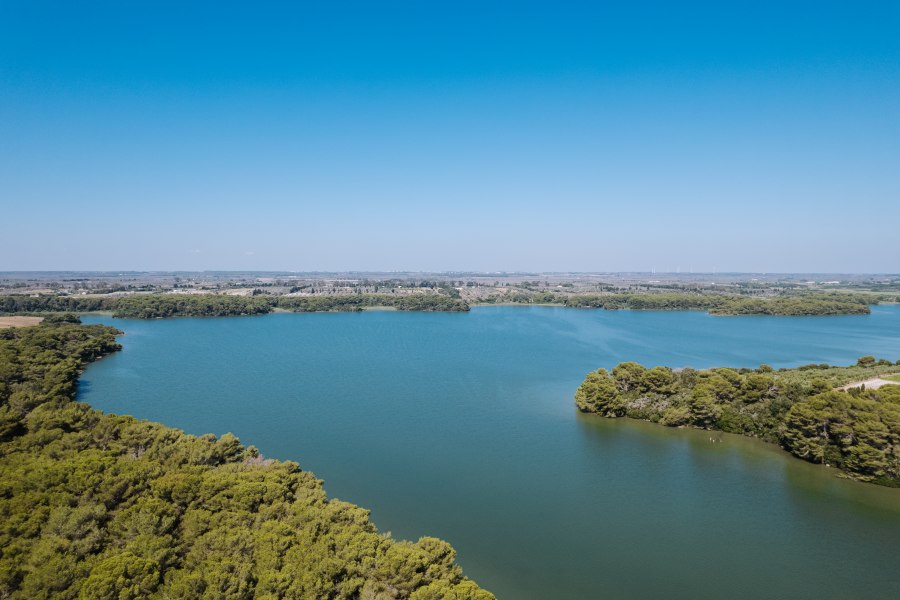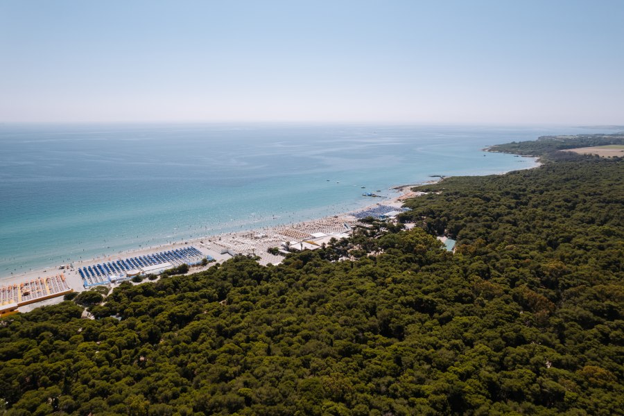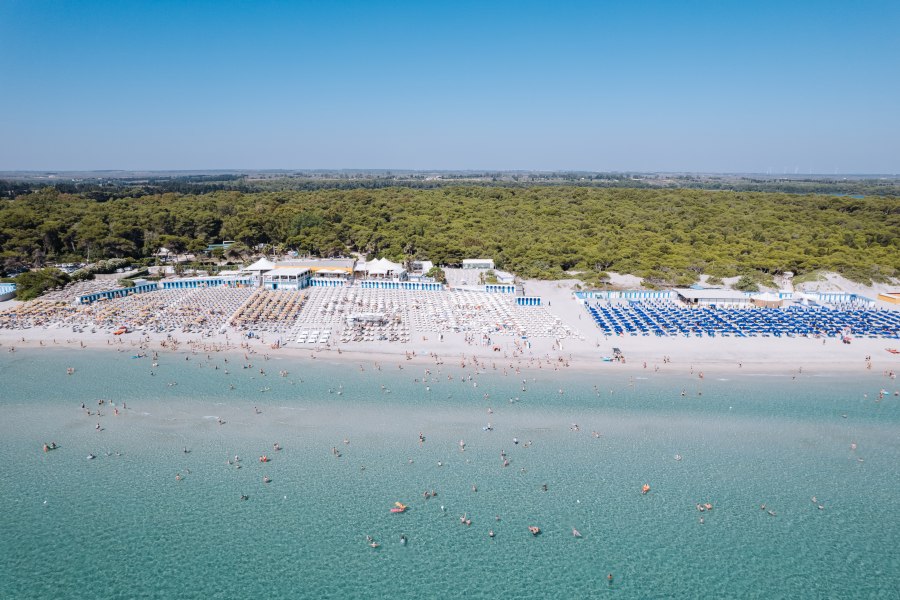 La spiaggia convenzionata si trova a 3,7 km ed è collegata da un comodo servizio navetta (ad orari prestabiliti). Il lido si estende su un’ampia distesa di sabbia fine con un mare azzurro e cristallino dal fondale dolcemente digradante. É attrezzato con ombrelloni e lettini, servizi igienici, docce e bar (gestione esterna, consumazioni a pagamento). A circa 1500 mt, nella zona dei laghi Alimini, si trova una spiaggia libera di sabbia fine, confinante con la pineta. Possibilità noleggio teli mare.