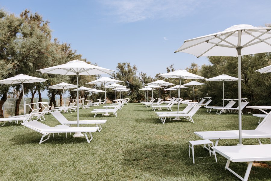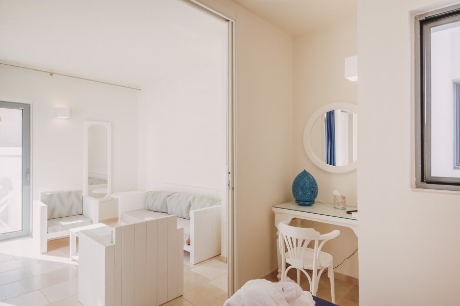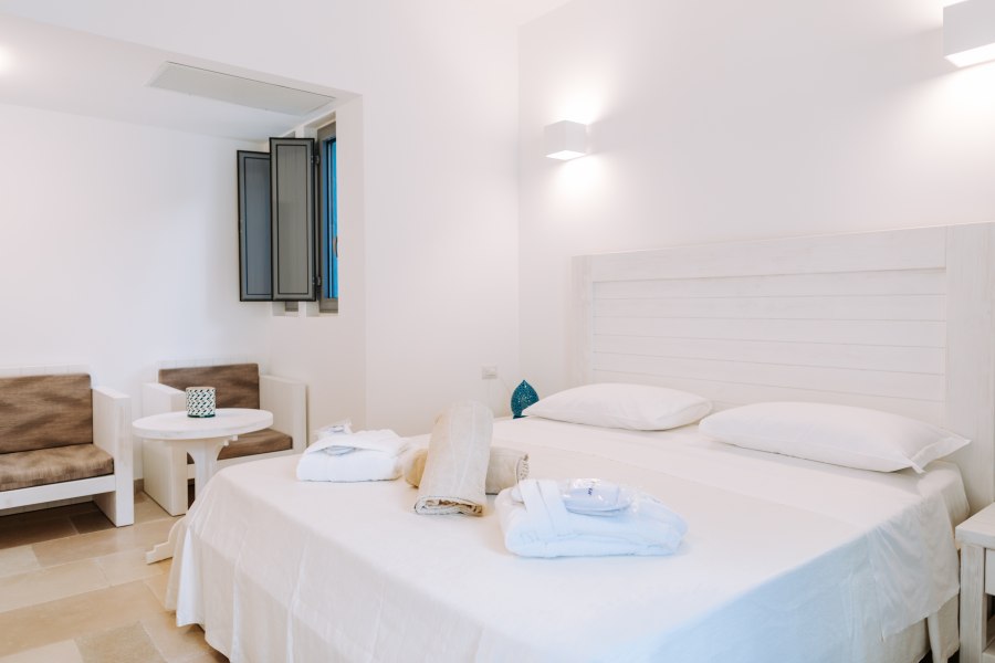 Le camere, arredate con cura, situate nella zona più vicina ai servizi, tutte al piano terra, sono dotate di aria condizionata autonoma, servizi con doccia e asciugacapelli, minifrigo, TV Led con servizio Sky e patio/terrazzino attrezzato. Si suddividono in: Comfort, con arredo di design, fino a 4 posti letto. Le triple e le quadruple dispongono di doppio ambiente con cameretta con letto a castello; Superior, fino a 3 posti letto, con arredi in legno total white, terrazzino privato e cassetta di sicurezza; Junior Suite, a 4 posti letto, costituite da camera con letto matrimoniale e camera con 2 letti separati; Junior Suite Superior (unico ambiente) a 3 posti letto, dispongono di terrazzino con lettino e sdraio e vasca esterna. Tutte le Junior Suite, con ingresso autonomo e terrazzino attrezzato, sono dotate di servizi con doccia, aria condizionata autonoma, TV 50 pollici, cassetta di sicurezza. Prevedono servizio cortesia Vip con accappatoio e bagnoschiuma all’olio di oliva, bollitore e macchina da caffè.