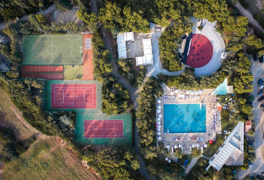 2 ristoranti, bar nella zona pineta, 2 piscine di cui una semiolimpionica per adulti e una per bambini, campo da calcetto in erba sintetica a 7, campo da tennis in cemento, campo da basket, beach volley, 2 campi da bocce, ping pong, anfiteatro, sala polivalente di circa 200 mq, parcheggio interno non custodito.