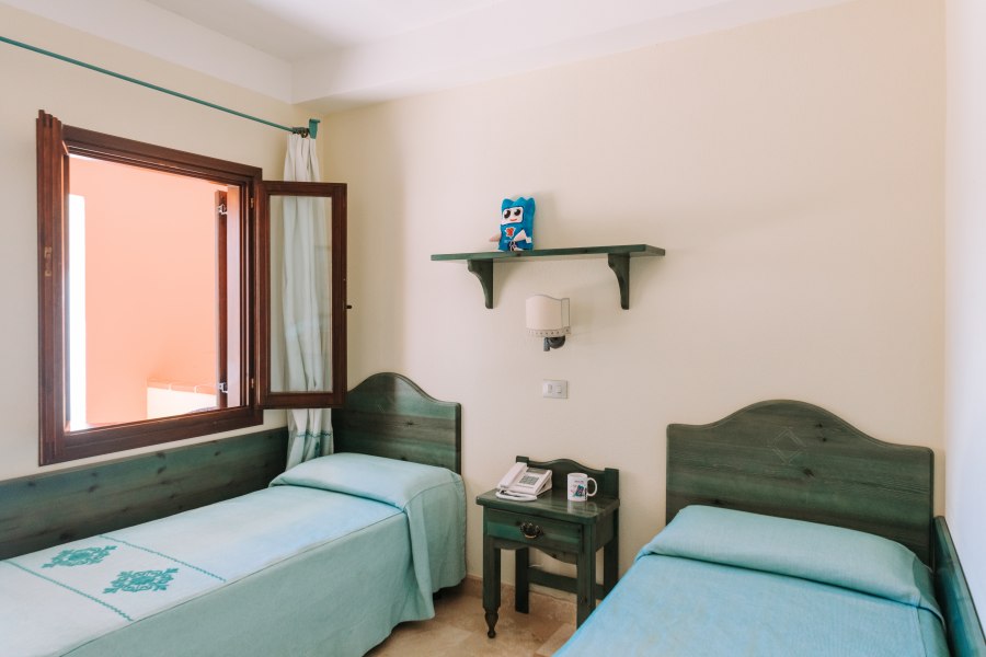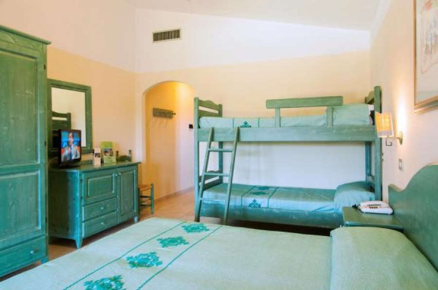 224 camere suddivise in edifici disposti come un tipico borgo. Le stanze sono arredate in stile sardo dai colori smeraldo e offrono aria condizionata, telefono, TV, minibar (consumazioni a pagamento), cassetta di sicurezza elettronica, servizi con doccia, asciugacapelli e set di cortesia; quasi tutte sono dotate di patio, veranda o balcone attrezzati. Si suddividono in: Classic, fino a 4 posti letto, con letto matrimoniale e 3° e 4° letto a castello per le quadruple; Family Classic, fino a 3 posti letto, con ingresso che si apre direttamente su una camera con letto singolo e camera matrimoniale, situate solo al terzo piano (senza ascensore); Family Comfort, fino a 5 posti letto, con ingresso che si apre direttamente su una camera con 2/3 letti e camera matrimoniale.