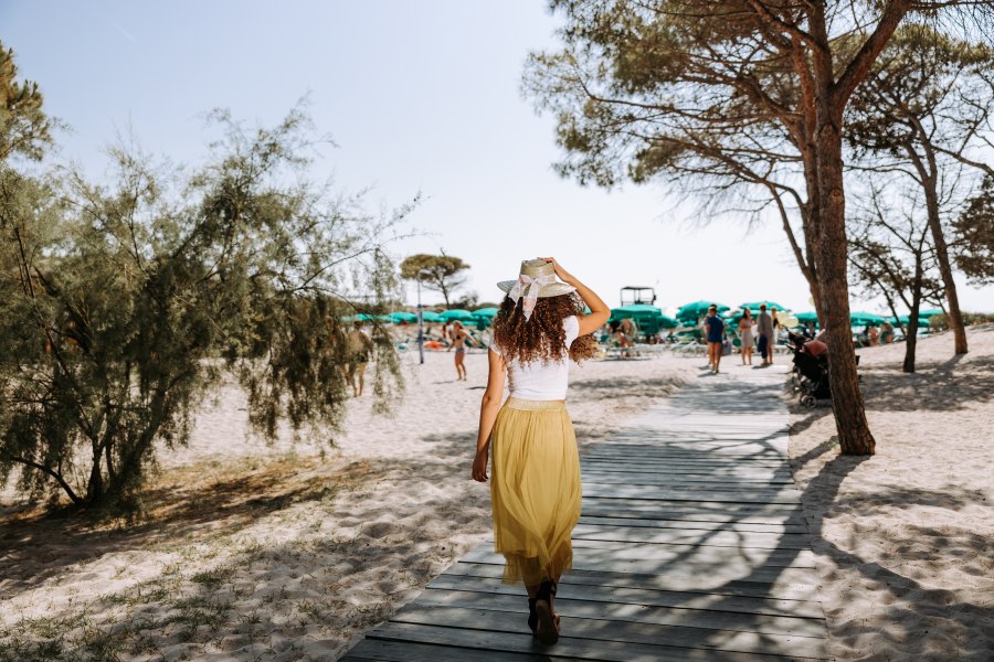 A 200 mt, ampia e di sabbia finissima, raggiungibile a piedi attraversando una folta pineta. Il lido è attrezzato con ombrelloni e lettini, bar, servizi igienici e docce. Possibilità noleggio teli mare.