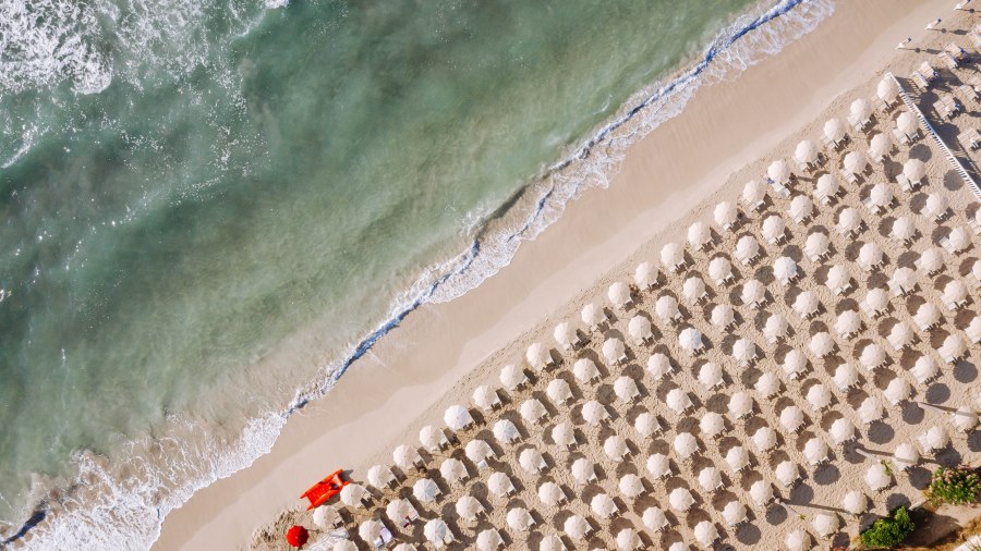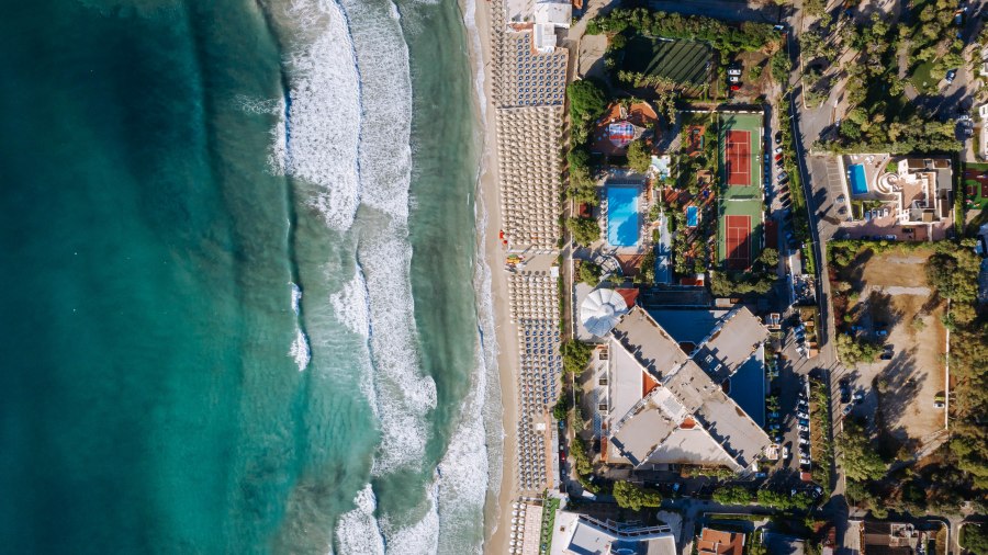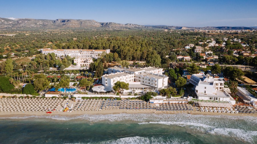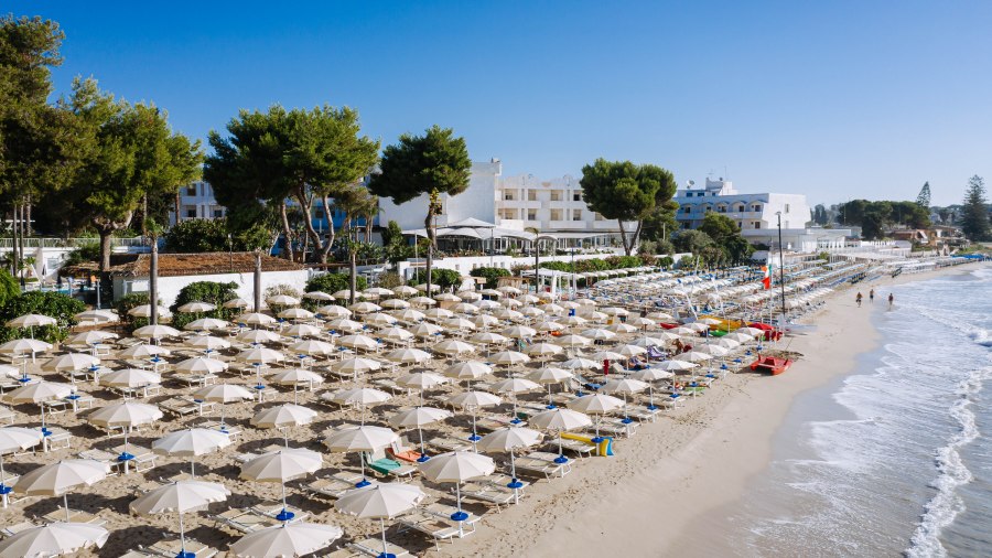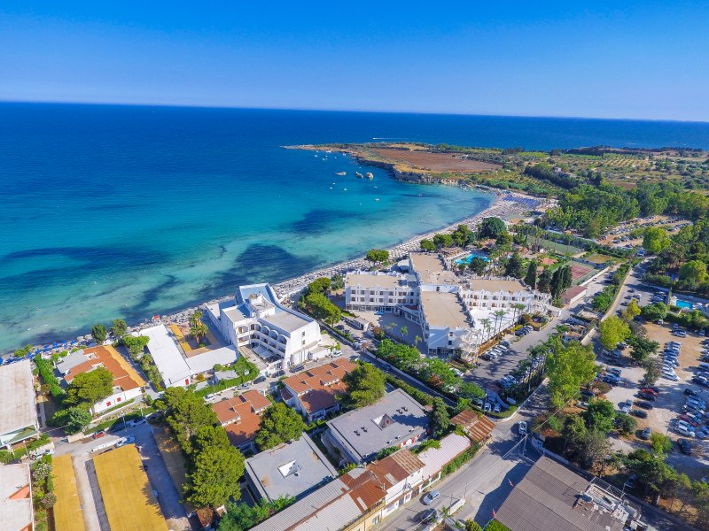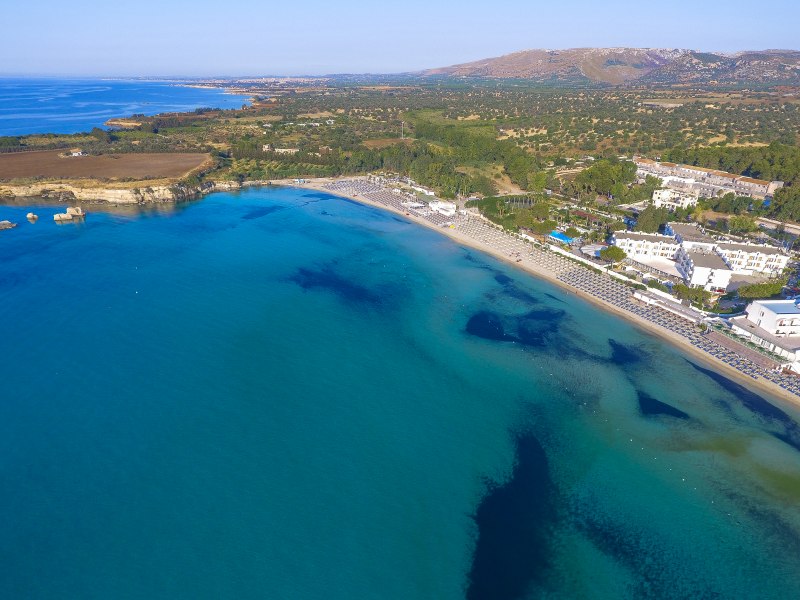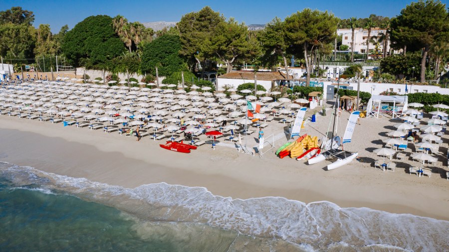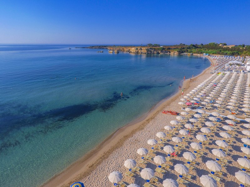 Spiaggia di sabbia bianca e fine, con fondale digradante. Lido privato e attrezzato con accesso diretto dalla piscina con ombrelloni, lettini e fornitura teli mare.