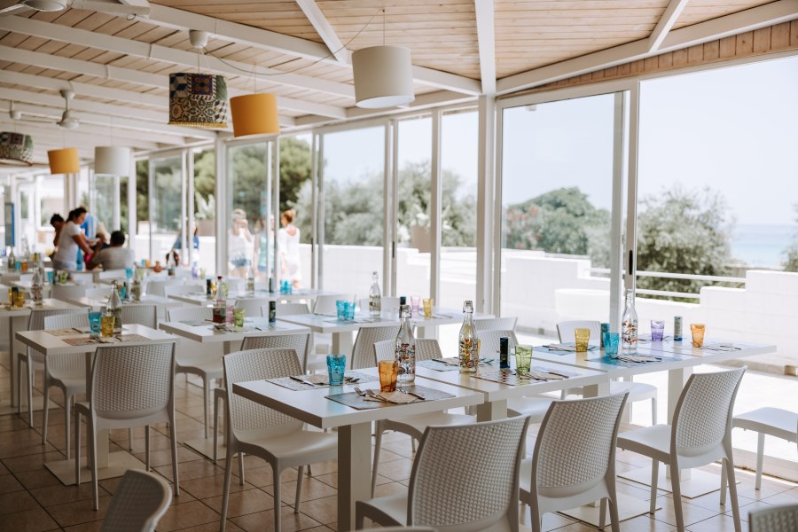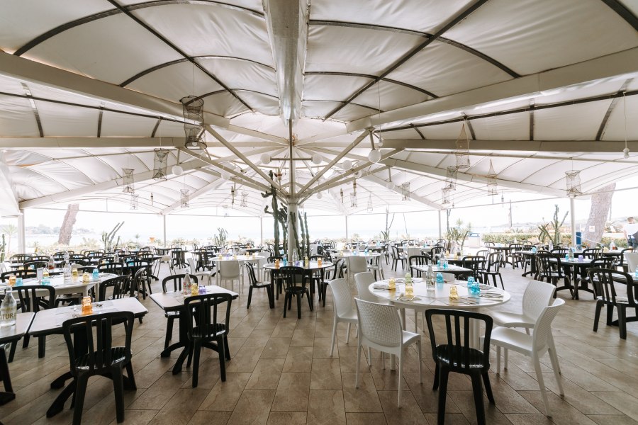 Ristorante con 4 aree distinte tra cui una veranda fronte mare semiaperta con ventilatore a pale, una sala interna con ampie vetrate e aria condizionata, una sala interna senza vista con aria condizionata, un’area esterna (Pagoda) fronte mare. Ogni sera, a luglio e agosto, angolo pizza espressa, a pranzo secondi di carne e pesce alla griglia. Durante la settimana sono previste serate a tema come siciliana, orientale, italiana, serata di pesce.