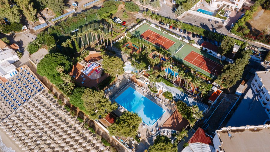 Ristorante, bar in piscina con angolo cocktail e bar nella hall aperto in caso di maltempo, teatro coperto (spettacoli di animazione e proiezioni in caso di maltempo), discoteca esterna, parcheggio privato interno o esterno scoperto non custodito. Piscina situata nella zona centrale direttamente sul mare, 2 campi da tennis in cemento, campo polivalente da calcetto in erba sintetica, beach volley,