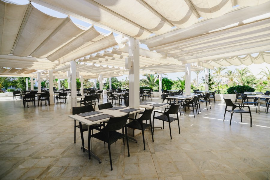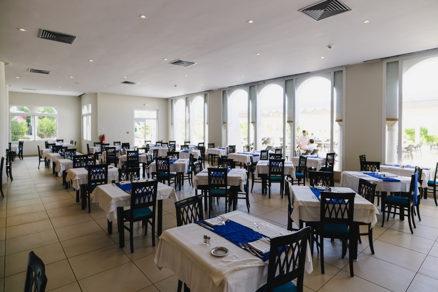 prevede colazione, pranzo e cena serviti a buffet con bevande incluse (soft drink, acqua, vino e birra locale alla spina) nel ristorante principale La Blue. BBQ El Sayadines aperto a pranzo e incluso nell'All Inclusive. Una cena per soggiorno inclusa nell'All Inclusive presso il ristorante a la carte Tunisino. Presso bar principale Rendez Vous (09.00-11.00) e il Bar Bistro (10.00-18.00) soft drink, acqua, vino e birra locale alla spina, selezione di cocktails alcolici e analcolici locali. Presso il Beach Bar Sable d'Or (10.00-18.00) soft drinks, Bar moorish El Machmou (16.00-24.00) thè alla menta.