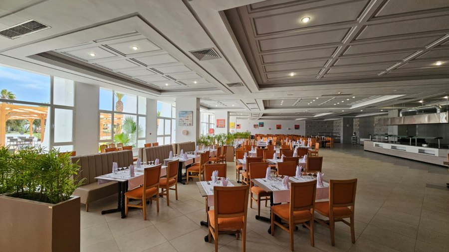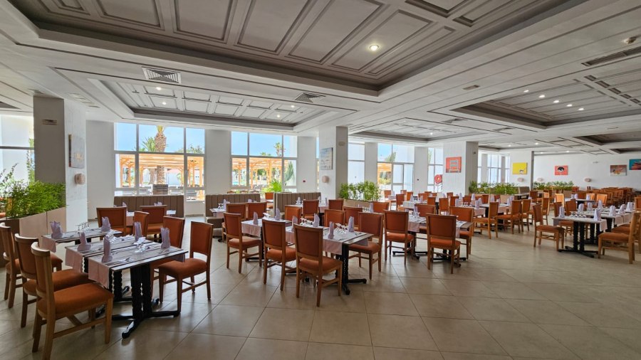 Colazione, pranzo e cena serviti a buffet con bevande incluse (acqua, vino locale e soft drink), specialità della cucina internazionale e show cooking pasta con cuoco Nicolaus. Presso il bar in piscina soft drink, acqua, vino e birra locale alla spina, succhi di frutta, liquori locali, sandwich, crepe, servizio colazione dalle 10 alle 11 e spuntino di mezzanotte. Presso l'American bar e il Lobby bar un'ampia selezione di analcolici e alcolici locali. Inclusa una cena per soggiorno presso il ristorante tunisino.