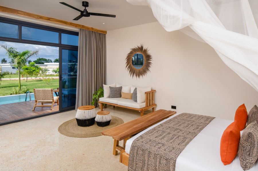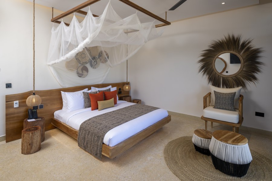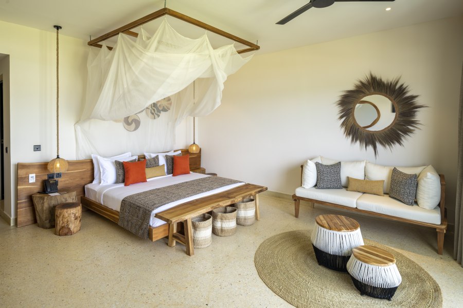 Le 151 camere elegantemente arredate sono disposte nel giardino, in blocchi a due e tre piani fronte mare, e si suddividono in svariate tipologie. Le camere partono da una metratura minima di circa 50mq e dispongono tutte di telefono, condizionatore, televisore, frigobar, bollitore per tè e caffè, asciugacapelli, accappatoio, wifi gratuito. Sono arredate in stile moderno con intriganti tocchi zanzibarini, oltre a terrazzo. La tipologia base è Deluxe Jacuzzi, sistemazioni fronte mare ma arretrate nel giardino, e a salire le Junior suite più ampie, le Premium Jacuzzi più prossime alla spiaggia, Sea Front e Bungalow con vista mare parziale. E’ inoltre presente una ulteriore divisione, con tipologie “swim up” che hanno accesso ad una piscina condivisa (tutte le Swim Up a partire dai 16 anni). Tutte le camere possono ospitare fino a tre persone.