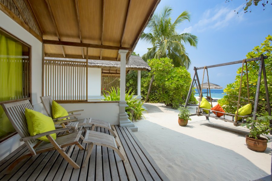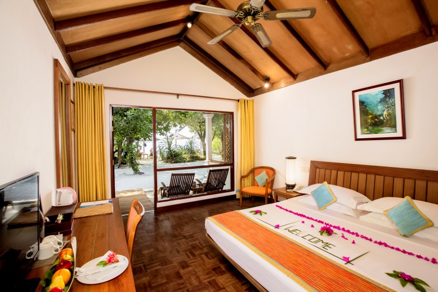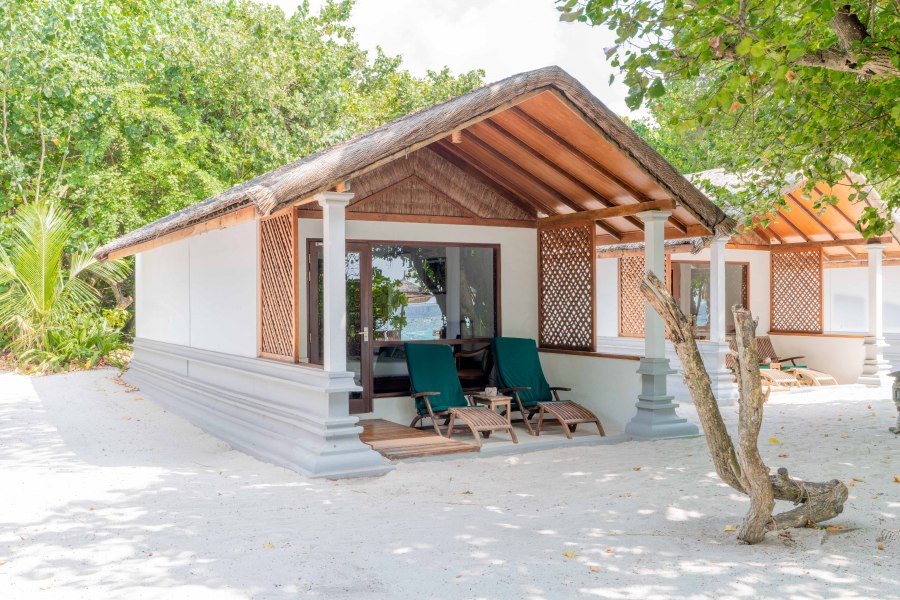 Il Reethi Beach Resort dispone di 110 camere suddivise in più tipologie tra cui Reethi Sunset Villa e Deluxe Sunset Villa. Arredamento semplice e funzionale tipico dello stile maldiviano, bagno maldiviano, terrazza privata, aria condizionata.
