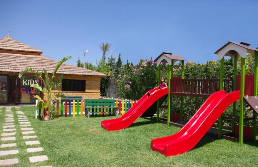 Reception, piscina esterna con sdraio e ombrelloni, ristorante, bar, palestra, area giochi per bambini.