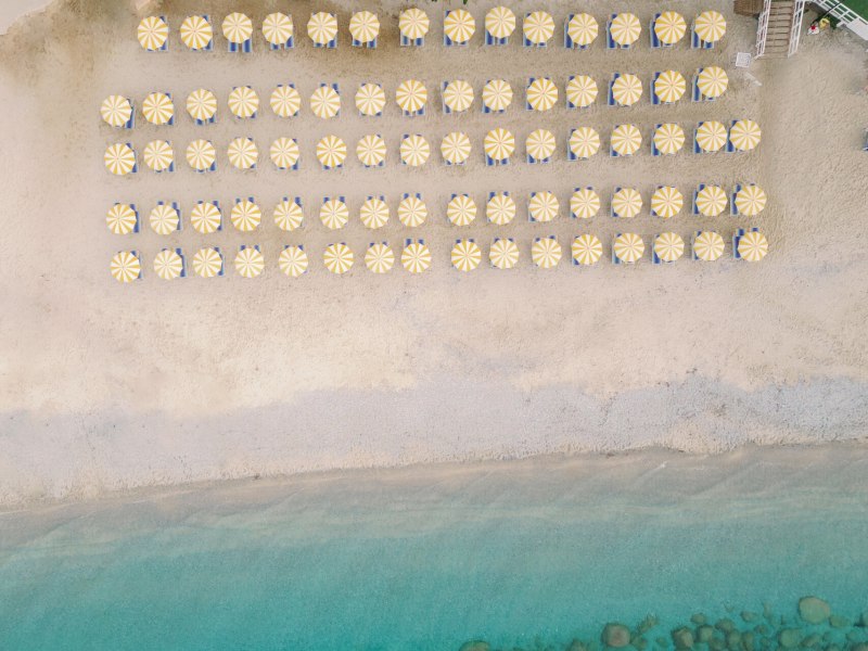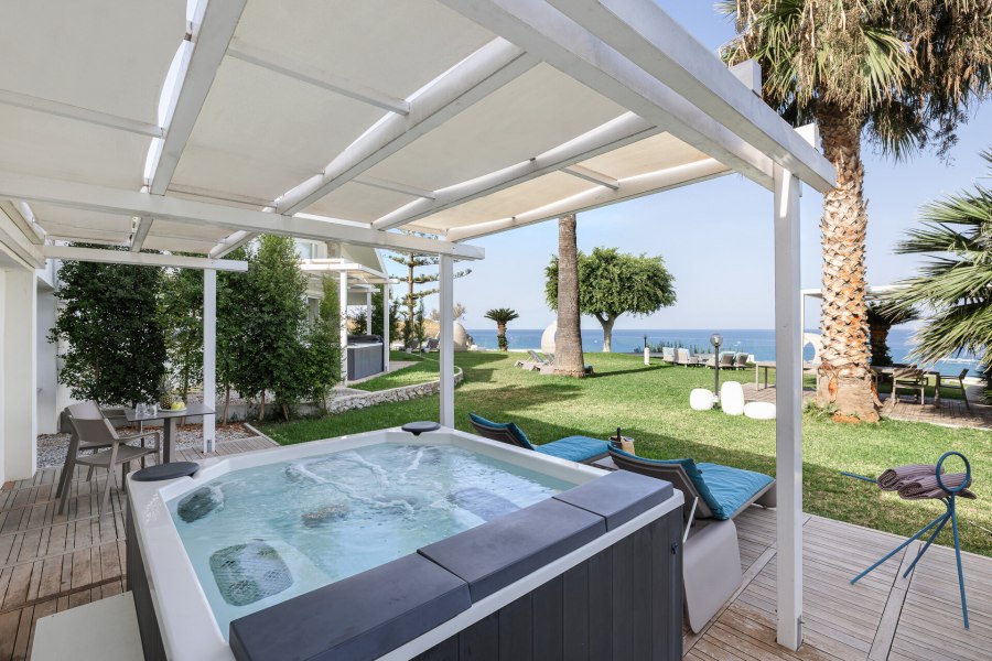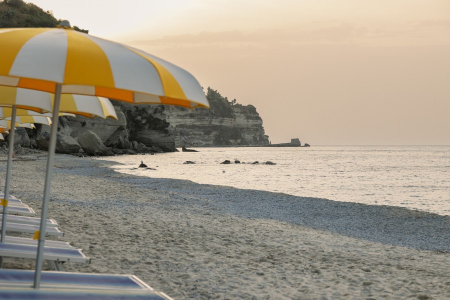 La spiaggia sabbiosa in leggera pendenza, attrezzata con lettini, ombrelloni e un ristorante sulla spiaggia, è facilmente raggiungibile tramite ascensore. Servizio spiaggia con 1 crema solare e 2 lettini (non prenotabili) inclusi nella quota.