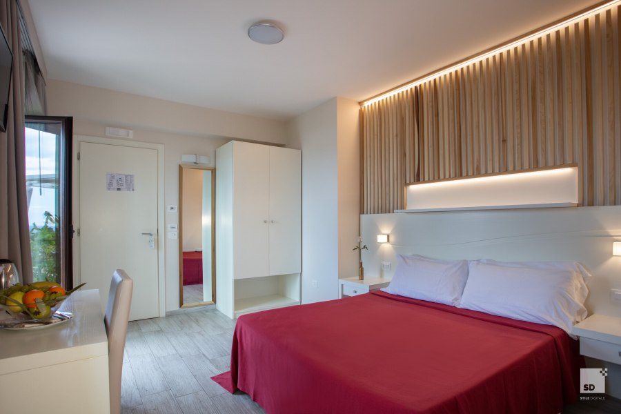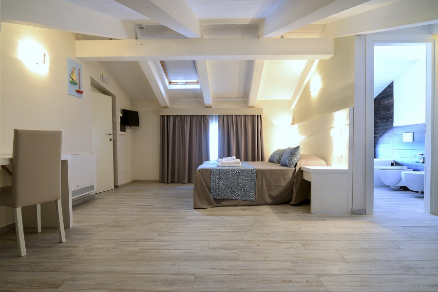 80 camere, caratterizzate da uno stile essenziale ma raffinato, la maggior parte con ingresso indipendente, tra Mansarda ubicate all’ultimo piano del corpo centrale, con finestra a lucernaio, Classic al piano terra con patio (alcune con portafinestra) o al primo piano con terrazzino, Classic Vista Mare con balcone, Superior dall’arredamento moderno, Comfort ampie e accoglienti, al piano terra con giardino o al primo piano con terrazzo, divise internamente tra zona giorno con divano letto e zona notte con letto. Dotazioni: servizi con doccia e phon (alcune camere Mansarda senza bidet), telefono, Wi-Fi, TV-Sat, mini frigo, cassaforte, aria condizionata centralizzata.