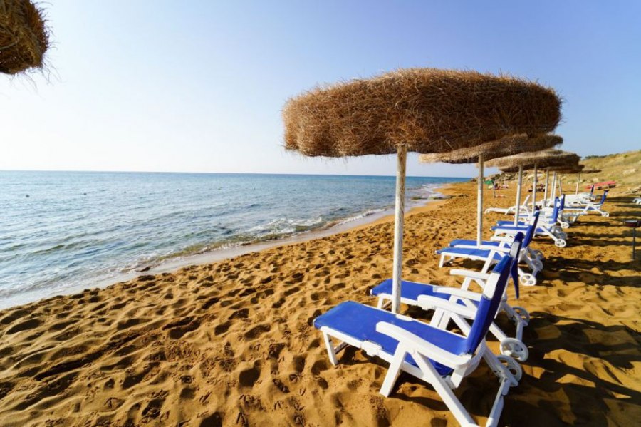Il Villaggio sovrasta il “Capo Fratte Vecchie” su di una spettacolare ed ampia baia di sabbia fine, dal colore rossastro contornata da scogli bassi. L’acqua, limpida e dagli splendidi colori che vanno dal verde al blu intenso, ha un fondale dolcemente digradante, particolarmente adatto ai bambini, mentre nelle zone laterali, scogliere e piccoli promotori rendono lo snorkeling un’attività di grande emozione fruibile da adulti e bambini. La spiaggia dista 300 metri ed è attrezzata con ombrelloni e lettini (inclusi a partire dalla 4° fila) e punto Mini-club. Nella spiaggia, ubicata in piena Riserva Marina Protetta, non è permessa l’installazione di servizi igienici, presenti presso il chiosco bar di gestione esterna al villaggio. Servizio navetta da/per la spiaggia ad orari stabiliti. Possibilità di noleggio di teli mare con cauzione.