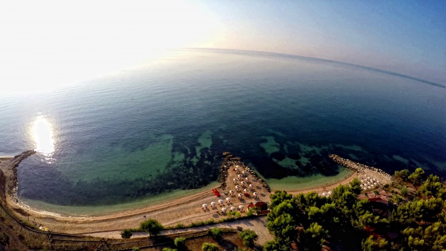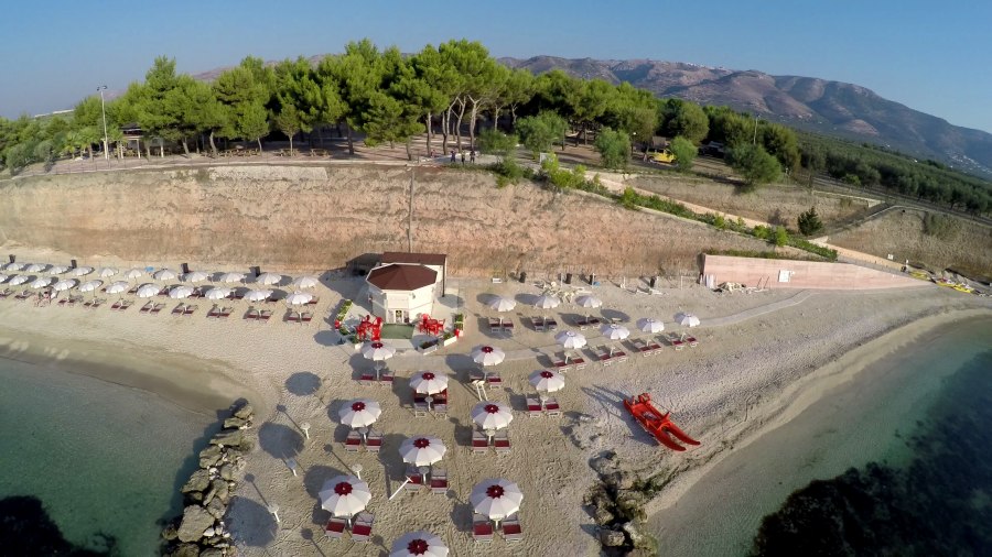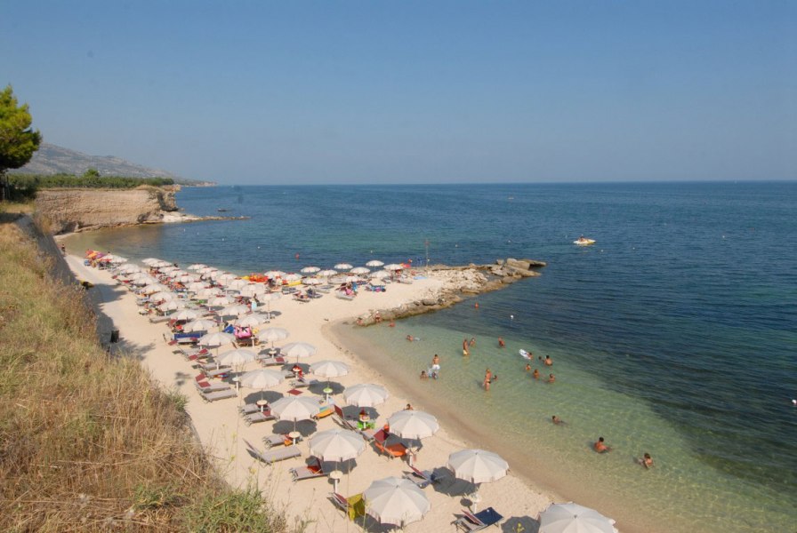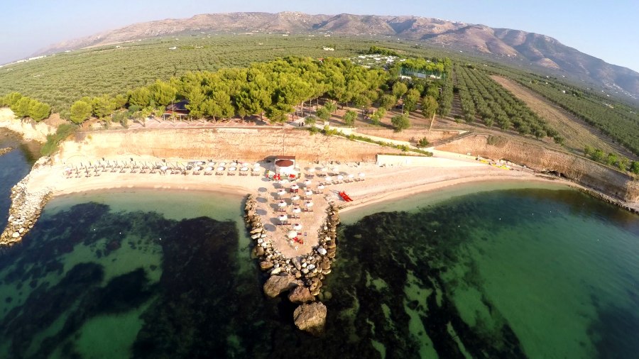 distante dai 100 ai 400 m dal mare, con ampia rampa di accesso alla spiaggia sabbiosa e rocciosa a sud di Mattinata, nell’ omonima “Baia del Monaco” affiancata da calette accessibili dal mare, fondale con sabbia, ghiaia e roccia. Spiaggia attrezzata con 1 ombrellone e 2 lettini ad appartamento, (1° fila per i Superior).