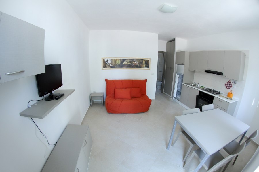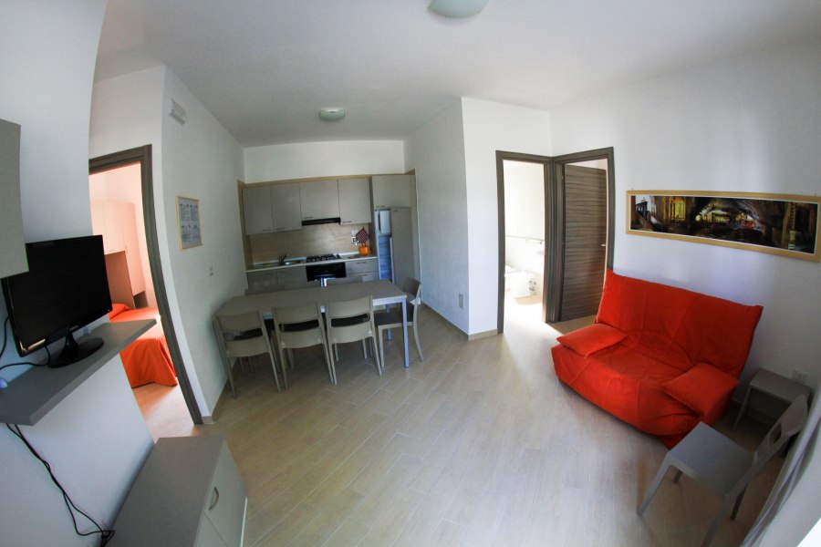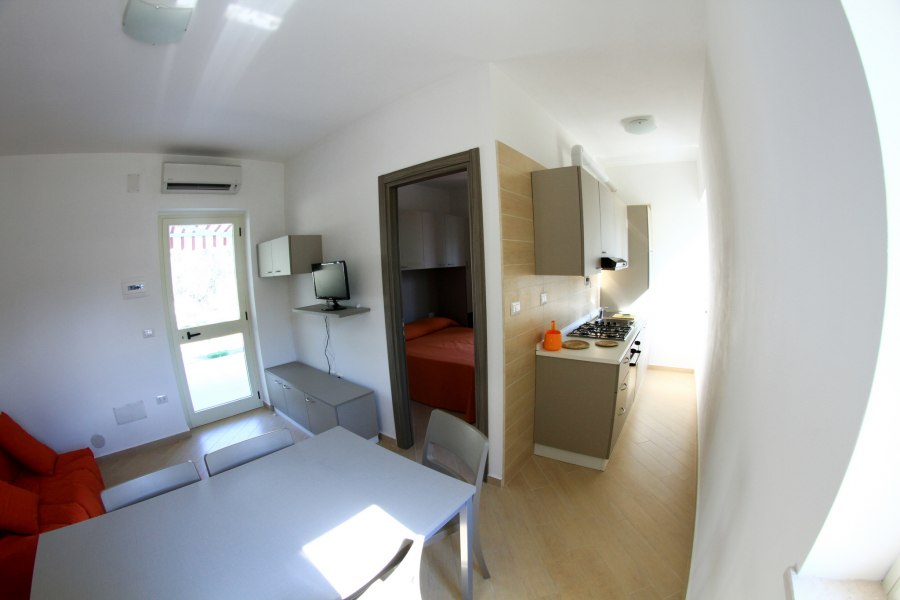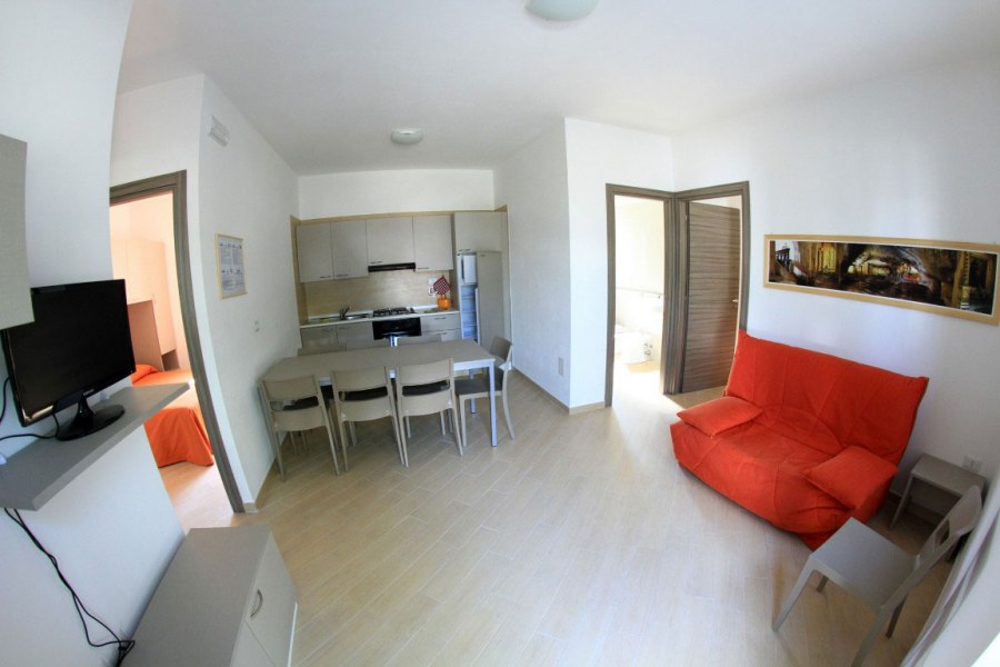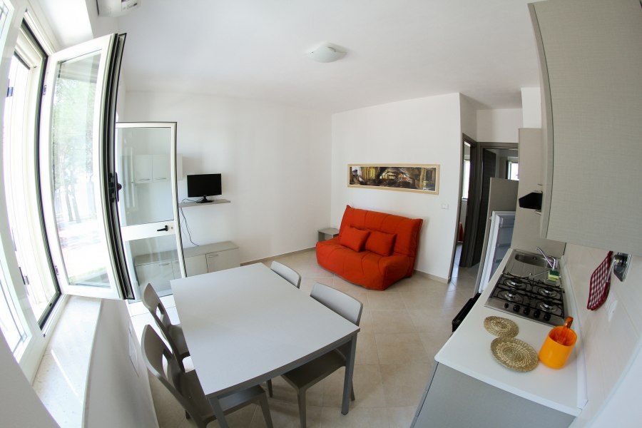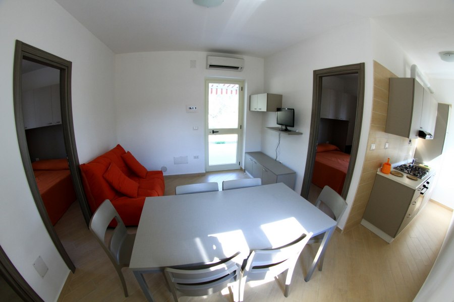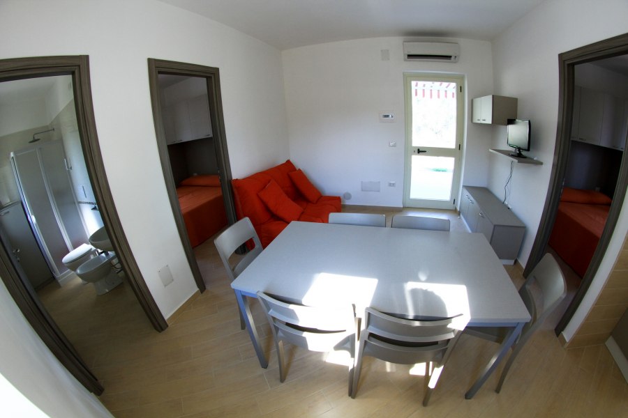 N. 16 appartamenti in muratura di 30mq, Bilo 4 Standard Plus, piano terra, a 200m circa dal mare composti da soggiorno con AC e TV, divano letto matrimoniale, angolo cottura con forno e frigorifero con cella freezer, camera da letto matrimoniale, servizi con doccia, esterno attrezzato con gazebo in legno, tavolo, sedie e poltrona sospesa nel patio condiviso con appartamento attiguo.
