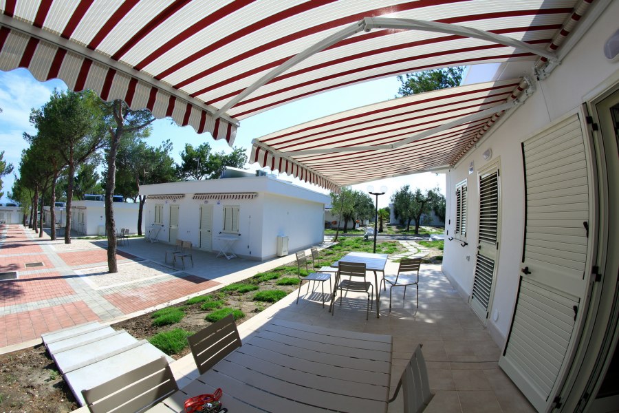 N. 10 appartamenti in muratura di 50mq, Trilo 4 Standard Plus piano terra, a 400m circa dal mare composti da soggiorno con AC e TV, divano letto matrimoniale, angolo cottura con forno e frigorifero con cella freezer, 2 camere da letto matrimoniale, servizi con doccia, patio esterno con gazebo in legno, tavolo, sedie e poltrona sospesa.