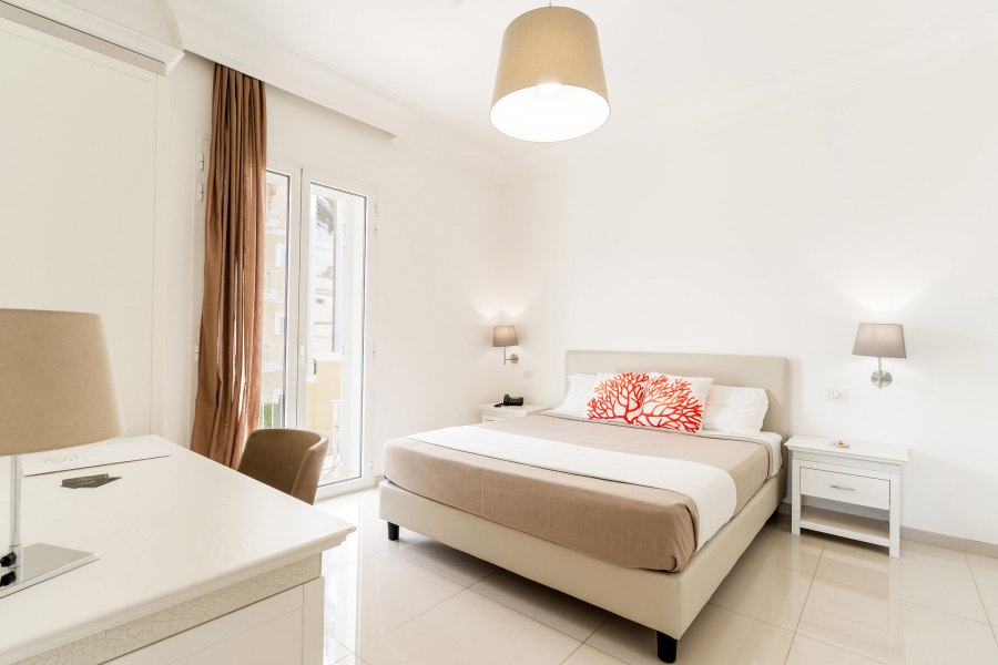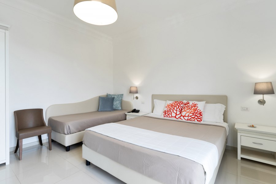 Hotel 60 camere di diversa tipologia, elegantemente arredate e dotate di tutti i comfort e dotate di domotica, climatizzazione con controllo termostatico, SMART TV Sat 32” Lcd, Mediaset Premium Sport, telefono, connessione wi-fi gratuita, cassaforte, frigobar, servizi privati con doccia/vasca ed asciugacapelli. Si dividono in: Standard tutte matrimoniali e qualche tripla (16 mq. ca); Comfort come le precedenti con possibilità di 3° letto (22 mq. ca); Superior con possibilità di 3° letto, rispetto alle precedenti offrono un terrazzino con affaccio sulla piscina; Deluxe con possibilità di 3° e 4° letto (40 mq. ca) arredate con eleganza, dispone di ampi servizi con doccia o vasca, con terrazzino che affaccia sulla piscina; Family Room con possibilità 3°- 4° letto, servizi privati, doccia o vasca idromassaggio, asciugacapelli, Smart TV LCD con ricezione satellitare, cassaforte, frigo-bar, telefono, collegamento gratuito ad Internet, climatizzazione con controllo termostatico e balcone.