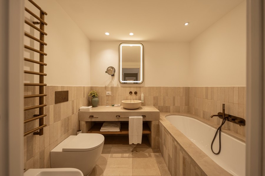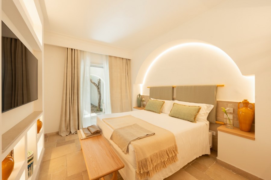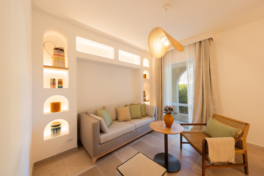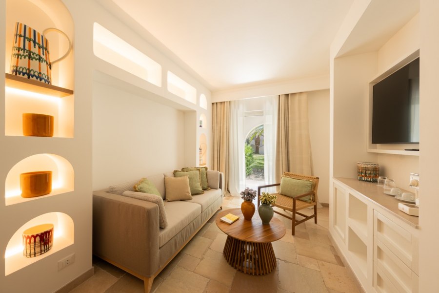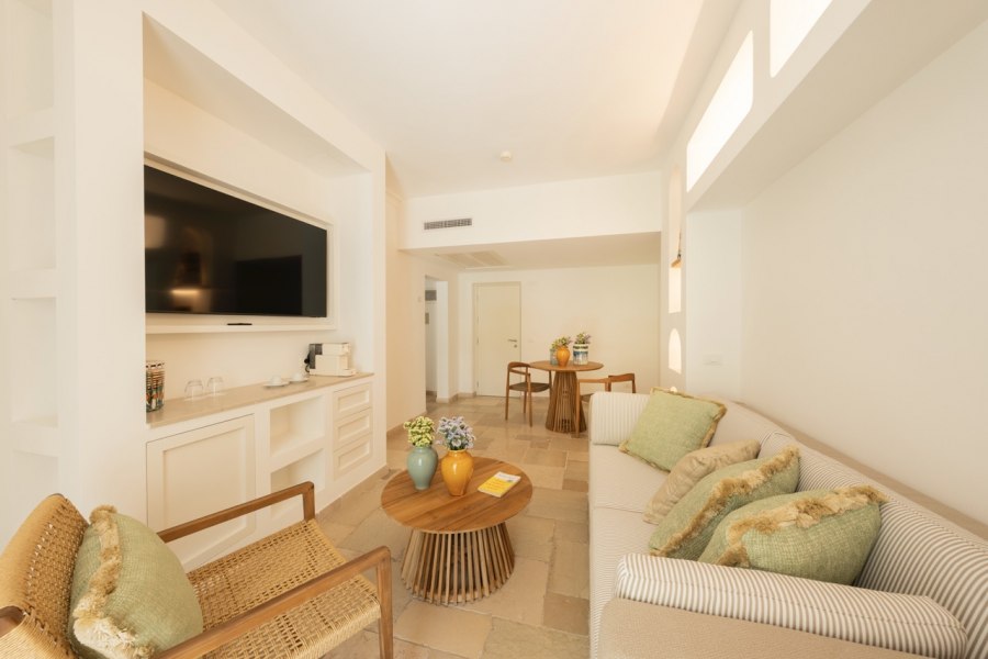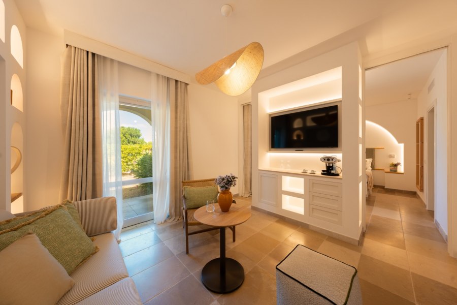 Junior Suite Prestige: di nuova concezione e completamente rinnovate nel 2025, le Junior Suite Prestige esprimono al meglio l’essenza di Ostuni a Mare, offrendo un perfetto equilibrio tra eleganza e comfort. Ideali per due persone, dispongono di un comodo letto matrimoniale, un’area relax con TV 55″, poltrone e tavolino, macchina del caffè e bollitore. I bagni, dal design moderno, sono curati nei minimi dettagli. Include parcheggio e servizio lettini in spiaggia (su disponibilità, dalla quinta fila in poi)