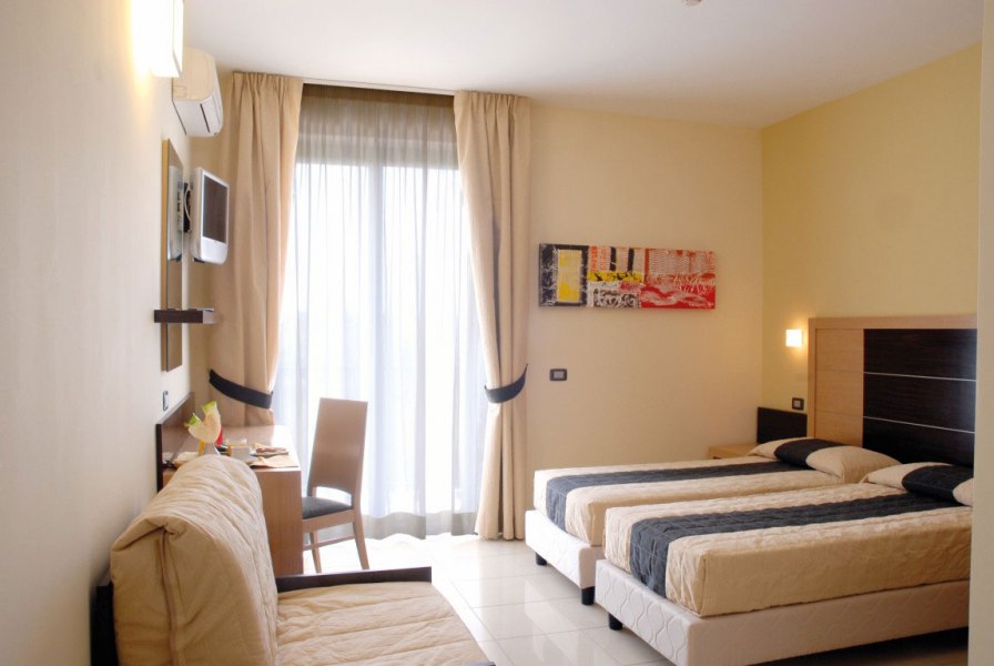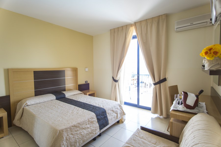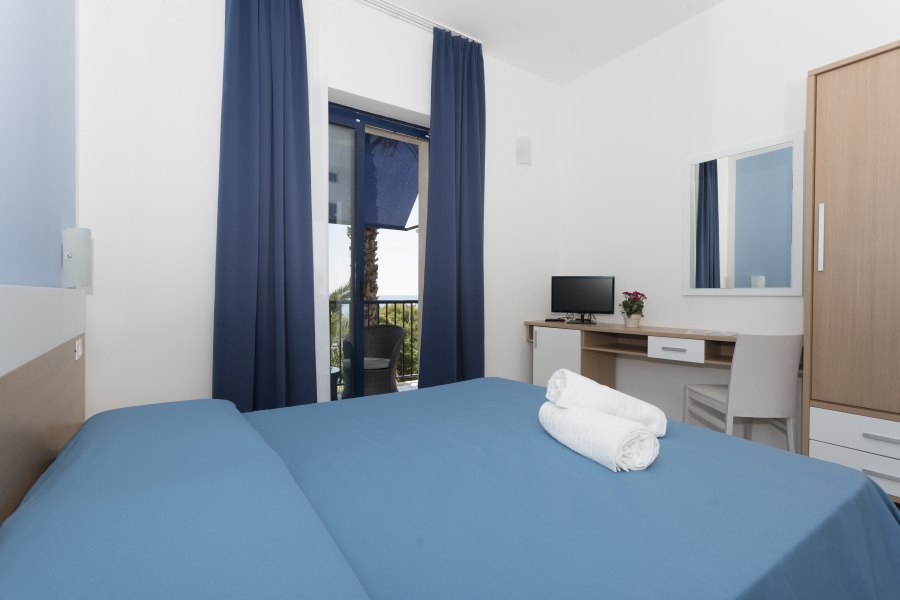 90 Camere dotate di telefono, tv, aria condizionata, frigobar (riempibile su richiesta), cassaforte e servizi con asciugacapelli. Disponibili camere triple con poltrona letto e camere quadruple con letto a castello. Possibilità di scelta tra tre diverse tipologie di camera. Camere Vista Mare: tutte con balcone fronte mare e recentemente rinnovate, vantano nuovi arredi, nuove dotazioni camera e un bagno completamente ristrutturato, possono ospitare fino a 2 persone. Camere Vista Piscina: possono ospitare fino a 4 persone, sono tutte dotate di balcone; Camere Vista Pineta: possono ospitare fino a 3 persone, dotate di balcone o finestra. La struttura, completamente priva di barriere architettoniche, è dotata anche di camere per diversamente abili.