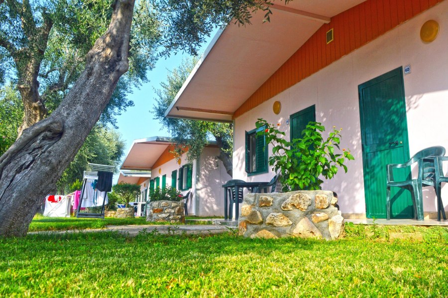 Villette Standard: sparse nel verde, dislocate nella zona più riservata e silenziosa della struttura, alcune con muro ad altezza d’uomo che separa il letto matrimoniale dai letti singoli.
