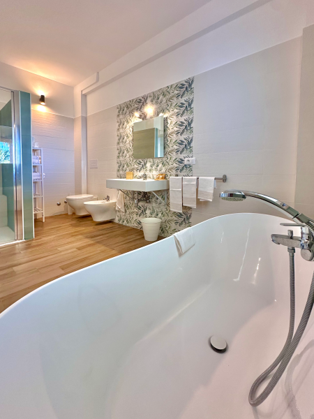 Junior Suite balcone vista mare: ampia camera completamente ristrutturata in stile moderno, in posizione privilegiata e centrale vicino ai servizi, gode di un grande balcone angolare privato ed attrezzato vista mare, TV con abbonamento Sky, cabina doccia e vasca da design contemporaneo a doppio schienale;