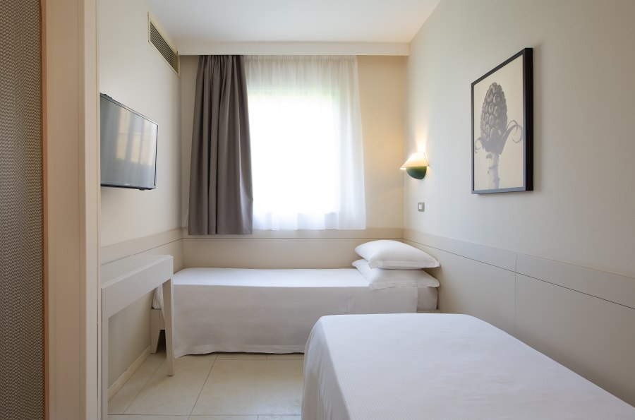 333 camere, spaziose ed arredate con gusto, distribuite in 10 Corti su due livelli, acquabar in libero servizio h24 in ogni corte. Dispongono tutte di balcone oppure patio con vista giardino, bagno con doccia e asciugacapelli, bilancia, bollitore per tè/caffè, telefono, SmartTv satellitare a schermo piatto, cassaforte, climatizzazione regolabile, minibar (a pagamento, allestimento solo su richiesta).