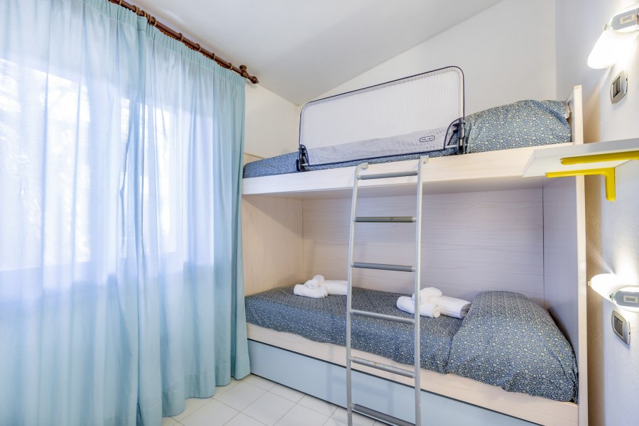 Trilocale “Silver” 5/6 posti letto (c.a 65 mq) su due piani, soggiorno- zona pranzo con tv color (No Sat), aria condizionata, divano letto a due posti, angolo cottura con frigorifero/congelatore (lt. 240) a doppia porta, camera matrimoniale, camera con due posti letto a castello, due bagni (di cui uno solo con lavandino e wc ed uno completo di doccia), patio e balcone. Dotazione di stoviglie per la cucina, sedie e tavolo per interno o esterno.