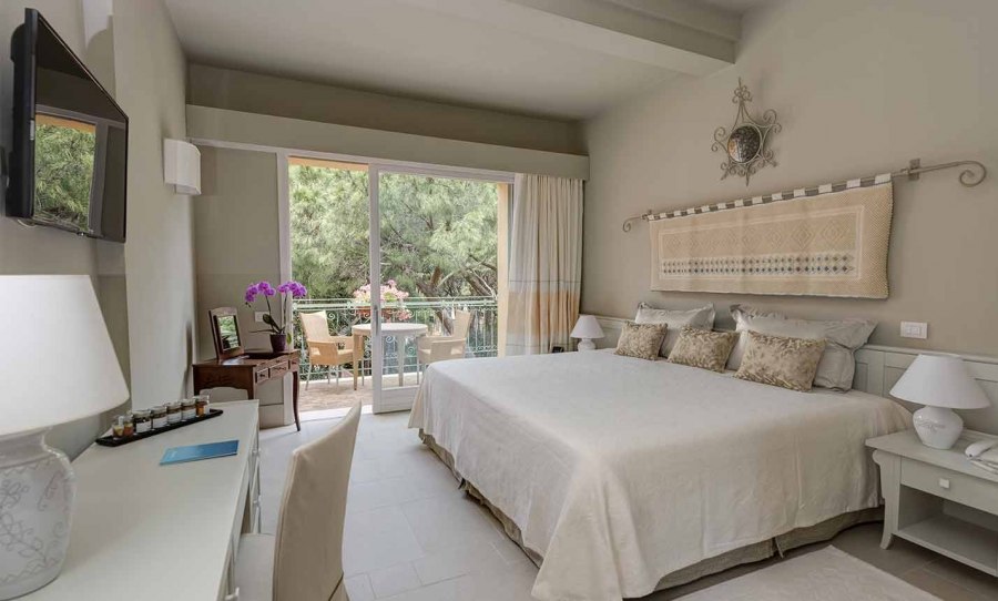210 camere, arredate in stile tipicamente sardo, tra Superior (20/24 mq) doppie o matrimoniali con balcone lato pineta, Superior Garden (25/29 mq) doppie o matrimoniali con balcone vista giardino, Superior Mare (28 mq) doppie o matrimoniali con balcone lato mare e Executive Mare (30/34 mq), doppie o matrimoniali con balcone lato mare. Camere comunicanti in Superior Garden, Executive Mare e Superior.