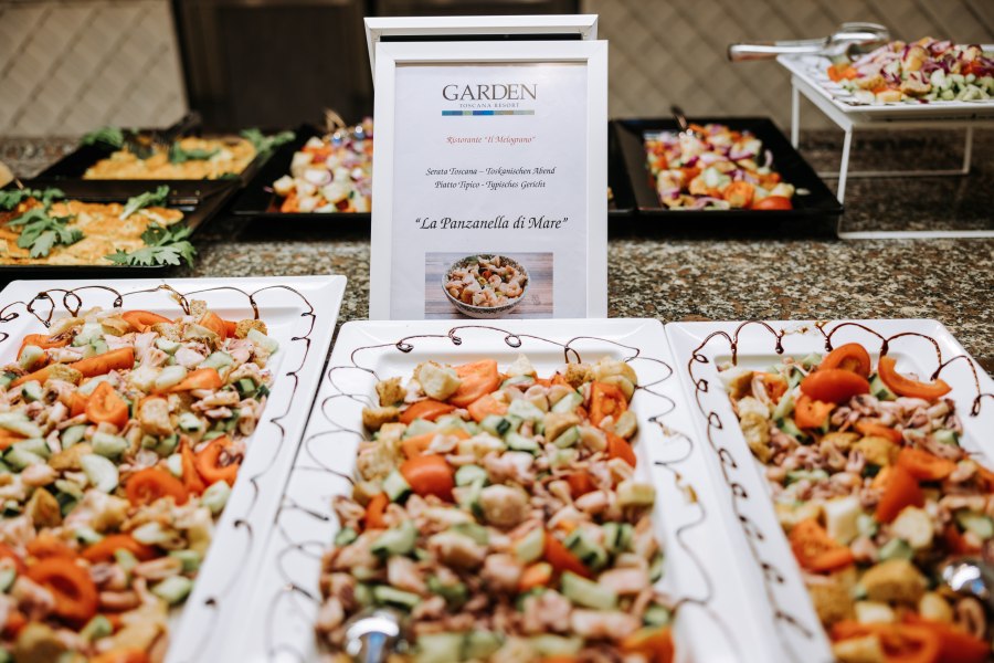 Il trattamento previsto è la pensione completa con acqua naturale e gasata microfiltrata a dispenser, soft drink a dispenser, vino toscano al calice inclusi ai pasti presso il ristorante Melograno con servizio a buffet servito dagli operatori di sala. I menù propongono piatti della migliore cucina mediterranea preparati con ricette locali e regionali italiane: non mancano pizzeria, grill e pasticceria fresca fatta