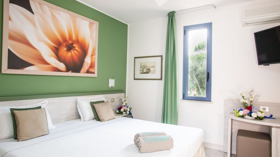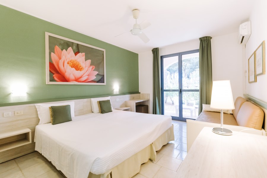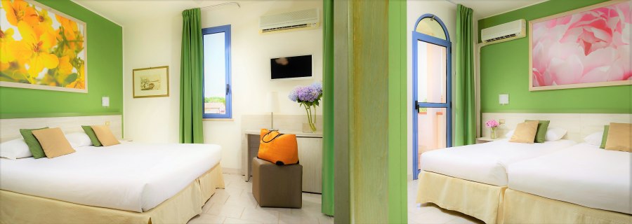 Comfort, fino a 3 posti letto con letto king size e divano letto, divisibile, con materassi di nuova generazione e doppi cuscini. A disposizione degli ospiti flat TV con 12 canali preselezionati del bouquet Sky, cassaforte digitale per laptop, servizio di frigobar in camera con refill giornaliero gratuito di acqua, soft drink e succhi, coffee station con cialde, linea cortesia luxury e special amenities, accappatoio e ciabattine, teli mare gratuiti con cambio incluso. Per i bambini fino a 3 anni non compiuti, è disponibile gratuitamente il baby kit che include lettino da campeggio (su richiesta, al momento della prenotazione), scaldabiberon, riduttore WC, mangiapannolini, accappatoio-poncho.